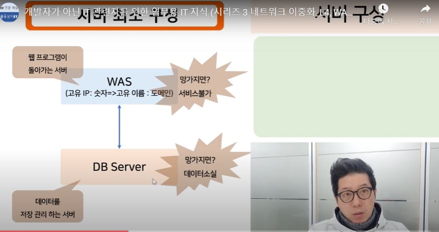 - WAS 서버가 망가지면 프로그램 안돌아감 서비스불가 DB 서버 망가지면 데이터가 다 날라감.